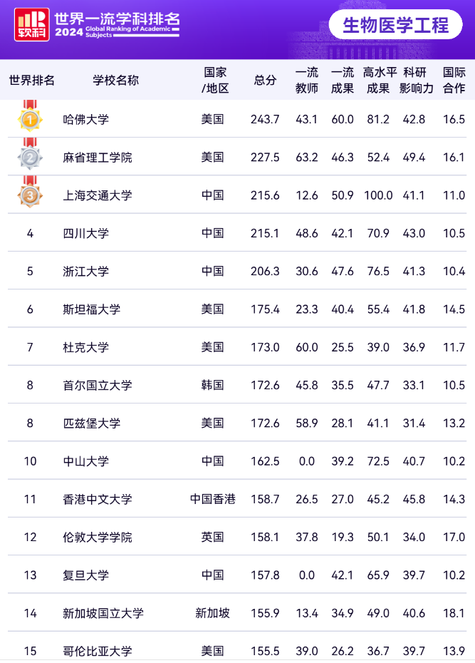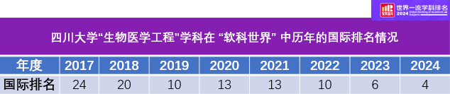 2024年11月11日,高等教育评价专业机构软科正式发布2024“软科世界一流学科排名”(ShanghaiRanking's Global Ranking of Academic Subjects)。2024软科世界一流学科排名覆盖55个学科,涉及理学、工学、生命科学、医学和社会科学五大领域。此次排名的对象为全球3000余所大学,共有来自96个国家和地区的1900余所高校最终出现在各个学科的榜单上。四川大学生物医学工程学科获得总分215.1,位列世界第4位。