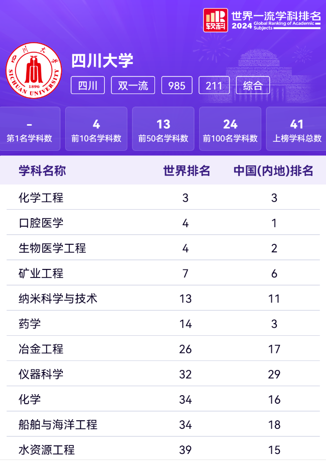 在2024“软科世界一流学科排名”中,四川大学共有41个学科上榜,其中排名世界前十的学科4个,分别为:化学工程(排名第3)、口腔医学(排名第4)、生物医学工程(排名第4)、矿业工程(排名第7)。