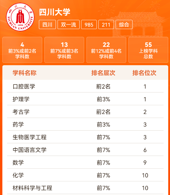 本次软科《中国最好学科排名》,四川大学共有55个学科上榜,其中,前3%或前2名学科2个,前7%或前3名学科13个,前12%或前4名学科22个。我院生物医学工程学科,在四川大学上榜的所有学科中排名第五。