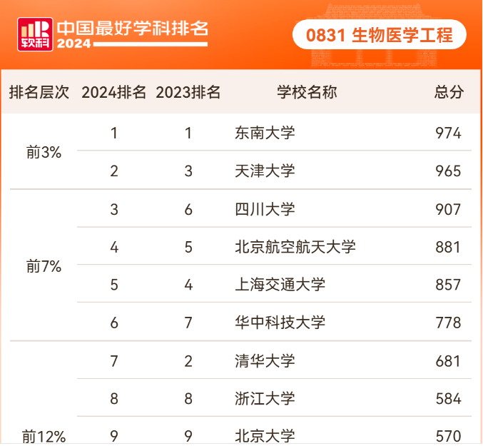 2024年10月15日,高等教育评价专业机构软科正式发布“2024软科中国最好学科排名”。四川大学“生物医学工程”学科名列全国第三名,较2023年排名提升了3个位次。