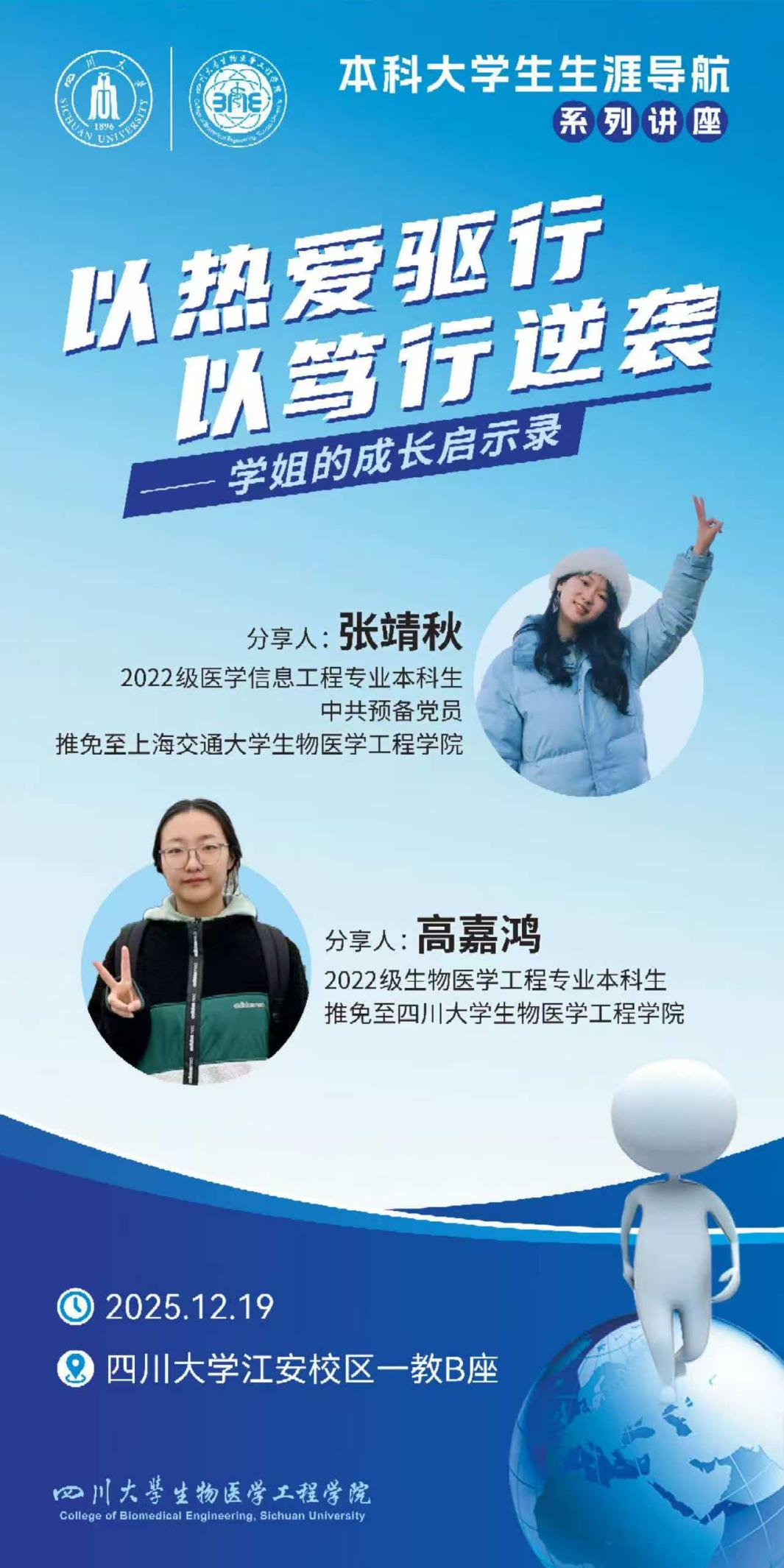 12月19日,学院同步举办两场针对性专场讲座。面向大二年级学生的“以热爱驱行,以笃行逆袭——学姐的成长启示录”讲座,邀请2022级医学信息工程专业张靖秋和生物医学工程专业高嘉鸿两位优秀学生分享经验。