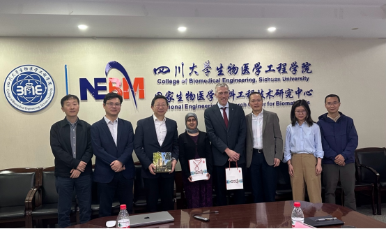 2026 年 4 月 1 日上午,英国利兹大学生物科学学院院长 Aysha Divan 教授、国际事务副院长 Ian Wood 教授一行访问国家生物医学材料工程技术研究中心及四川大学生物医学工程学院,双方在望江校区生物材料楼611会议室举行了友好会谈。国家生物医学材料工程技术研究中心主任、四川大学生物医学工程学院院长王云兵教授,国家生物医学材料工程技术研究中心副主任樊渝江教授、范红松教授及学院生物医学工程系主任杨为中教授,医学信息系韩骁教授,院长助理张仕勇教授等热情接待了来访嘉宾。利兹大学中国办公室及四川大学国际交流与合作处代表参加了会谈。
